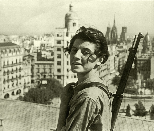 Le foto di questo post ritraggono Marina Ginestà. Nelle prime due, è immortalata a 17 anni col fucile in spalla dal fotografo Juan Guzmán, il 21 luglio 1936, sulla terrazza dell’Hotel Colón di Barcellona, quand’era una giovane miliziana comunista delle Joventuts Socialistes Unificades de Catalunya, appena due giorni dopo la sollevazione del proletariato catalano contro i golpisti di Franco. Nella terza, invece, un’orgogliosa Marina, settantadue anni dopo, nella sua casa di Parigi [città dove è morta il 6 gennaio 2014].