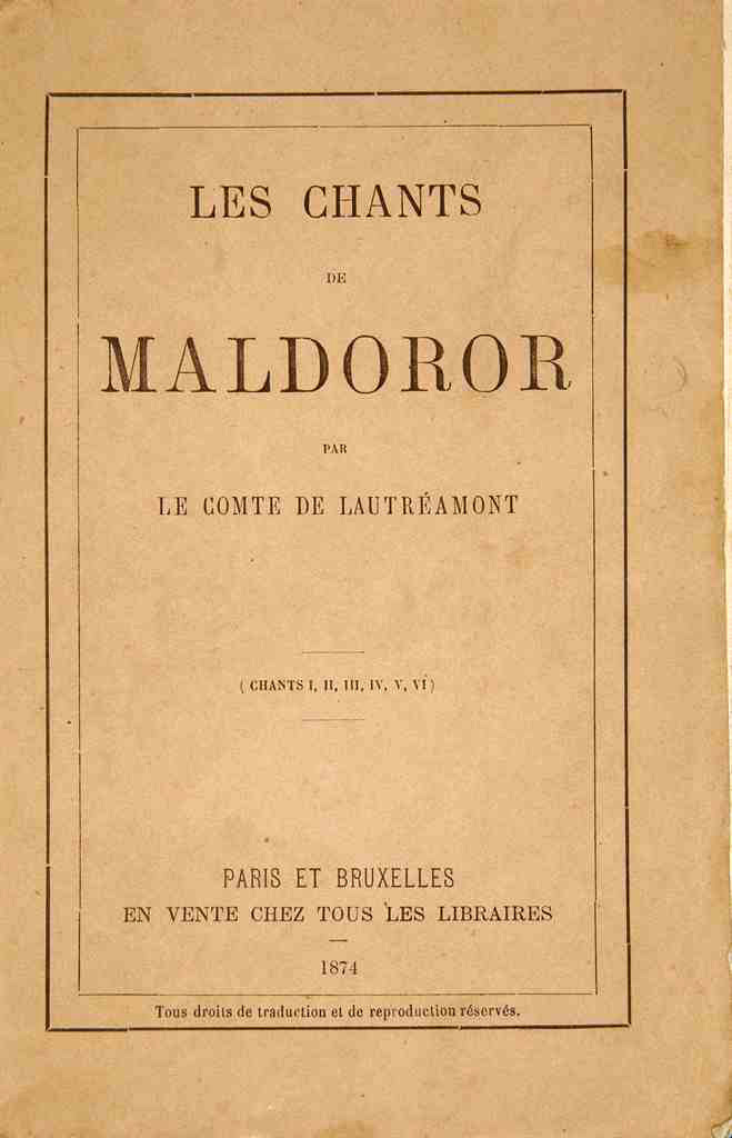 (…) Dopo la morte di Ducasse, Lacroix cede l’edizione originale di Maldoror al libraio Jean-Baptiste Rozez di Bruxellex, che la rilega e la commercializza con una copertina diversa. È questa l’edizione che finirà tra le mani di alcuni giovani scrittori belgi che, non solo ne pubblicheranno un estratto sulla loro rivista nel 1885, ma ne spediranno pure alcune copie in Francia a Bloy, Huysmans e Péladan. Léon Bloy, a sua volta, dedicherà a Les Chants de Maldoror cinque paragrafi del romanzo Le Désespéré e un articolo sul periodico La Plume, restando però convinto che l’autore avesse finito i suoi giorni rinchiuso in manicomio. Dello stesso avviso sarà Remy de Gourmont, che nel 1891 rivela l’esistenza dei due fascicoli di Poésies, dei quali fino ad allora si era persa ogni traccia. Ma bisogna attendere il 1914 perché Valery Larbaud ricordi sulle pagine di La Phalange la presenza alla Bibliothèque nationale dei soli esemplari noti di Poésies. Venuto a conoscenza dell’articolo di Larbaud, sarà André Breton a ricopiare a mano Poésies I e II e a pubblicarne il testo sulla rivista Littérature nel 1919.