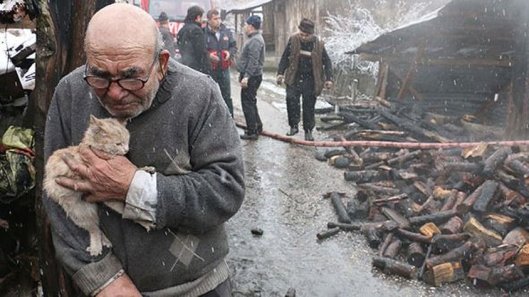 La foto ha a che fare con un piccolo fatto di cronaca avvenuto in un villaggio turco e risalente a qualche anno fa: l’ottantatreenne Ali Meşe tiene stretto al petto un gattino dopo l’incendio della sua casa.