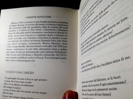 Il mio testo, amorosamente osceno, s’intitola Volevo una carezza, e, come mi faceva notare Paolo di recente con non poca ironia, è posizionato perfettamente al centro del libro, tipo paginone centrale di Playboy [rido]. Allego foto “storta” per invogliarvi a stalkerare il Castronuovo, al quale vanno i miei più sinceri ringraziamenti per lo spazio concessomi.
