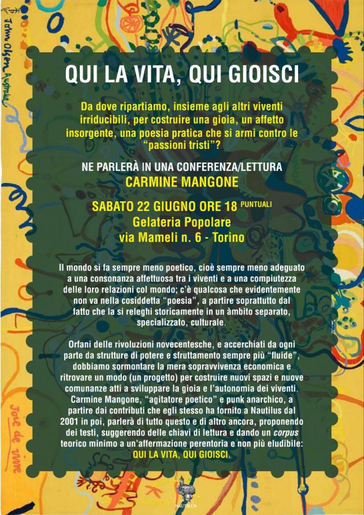 Siccome il mondo si fa sempre meno poetico, cioè sempre meno adeguato a una consonanza affettuosa tra i viventi e a una compiutezza delle loro relazioni col mondo, c’è qualcosa che evidentemente non va nella cosiddetta “poesia”, a partire soprattutto dal fatto che la si relega storicamente in un àmbito separato, specializzato, culturale. Orfani delle rivoluzioni novecentesche, e accerchiati da ogni parte da strutture sempre più “fluide” di potere e sfruttamento, occorre trovare un modo (un progetto) per costruire nuovi spazi e nuove comunanze per la gioia e l’autonomia dei viventi. Carmine Mangone, “agitatore poetico” e punk anarchico, a partire dai contributi che egli stesso ha fornito all’avventura chiamata “Nautilus” dal 2001 in poi, parlerà di tutto questo e di altro ancora, proponendo dei testi, suggerendo delle chiavi di lettura e dando una base teorica minima a un’affermazione perentoria e non più eludibile: QUI LA VITA, QUI GIOISCI.