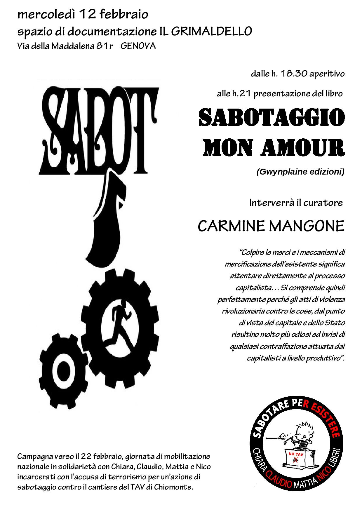 Mercoledì 12 febbraio 2014 :: Spazio di documentazione Il Grimaldello, via della Maddalena n. 81r, GENOVA :: Presentazione di Sabotaggio mon amour e dibattito su NOTAV, azione diretta e dinamiche statali controinsurrezionali.